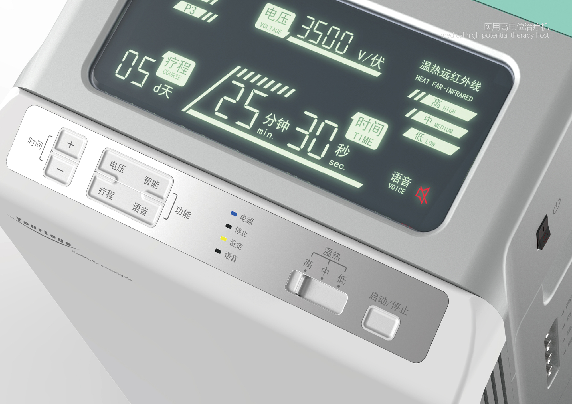 主机尺寸:550*620*1200(mm),输出电压30000V,电流小于3mA。底部带轮子和刹车装置,保证机器稳定。扩大的显示屏和文字,方便老年朋友查看,金属面板,易于清洁和消毒;倾斜的面板设计,人机化的考虑;淡雅的配色,符合医疗机构的环境;无锐角设计,外形大方,体现安全。